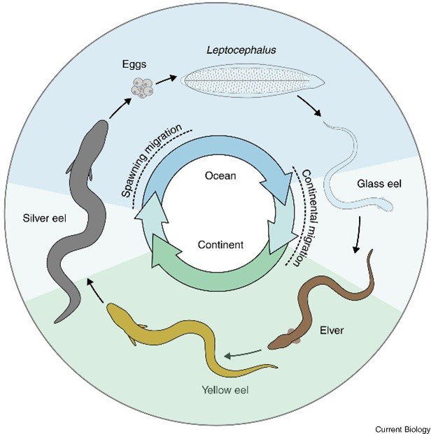 Figure 2. Eel (Anguillid sp.) catadromous lifecycle. (Source: Williamson et. al., 2023)