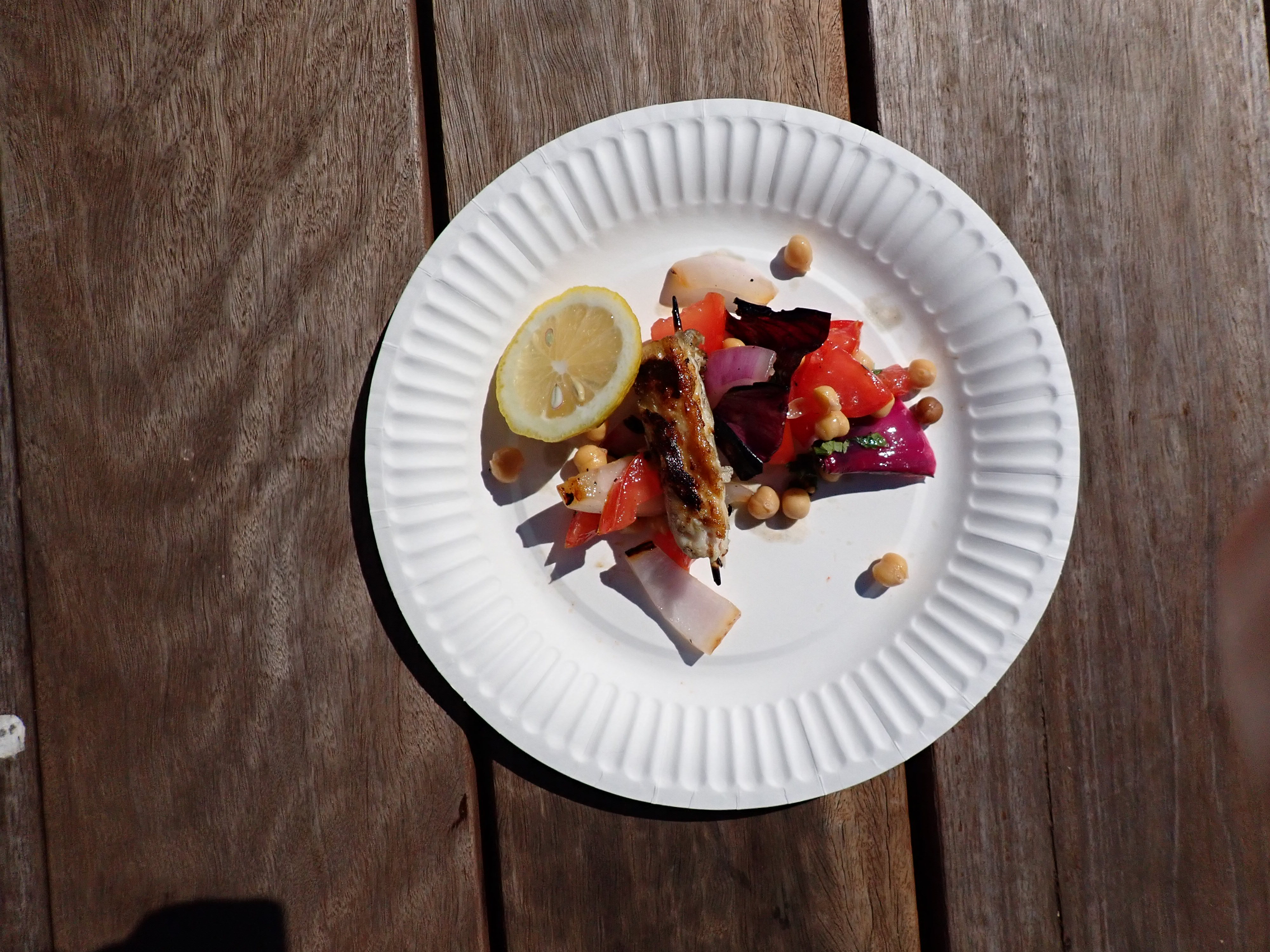 Gummy shark kebabs with wild fennel pesto, tomato, chickpea, and burnt onion salad