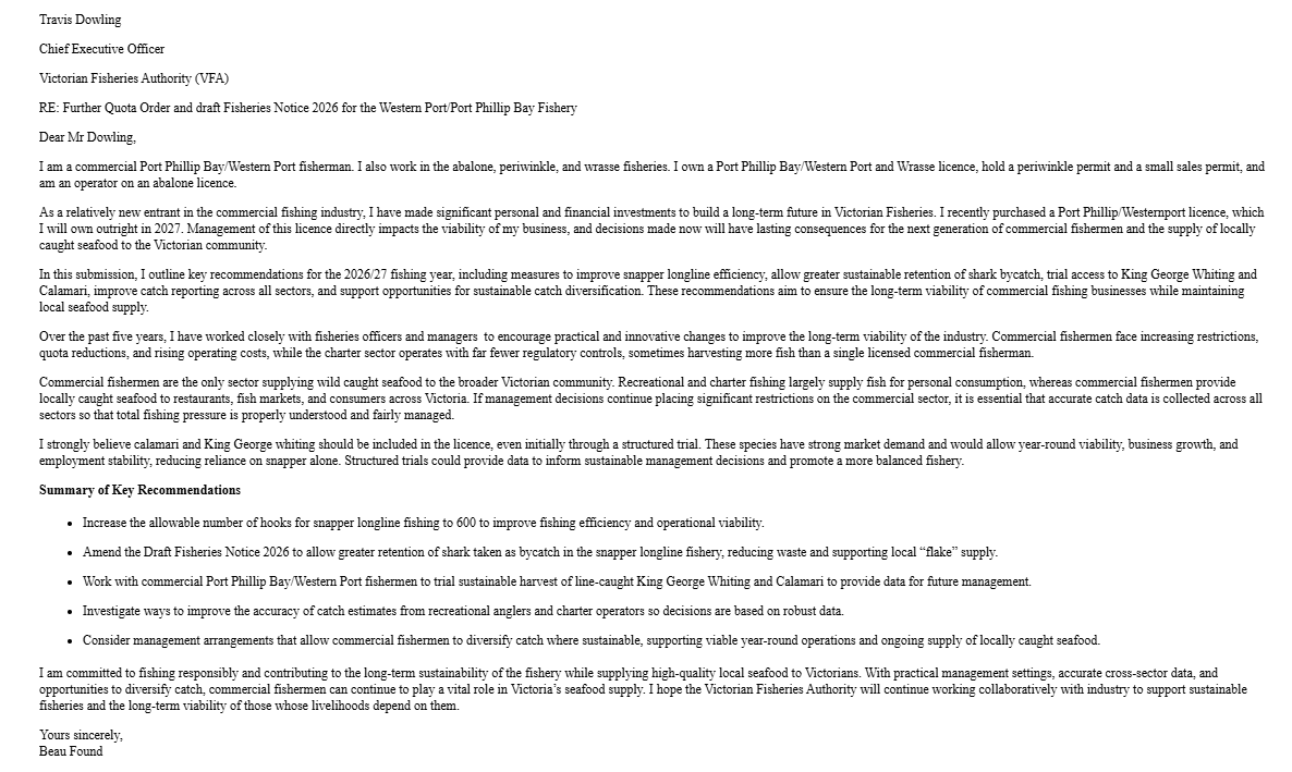 | Consultation for the 2026/27 Further Quota Order for snapper and Fisheries (Western Port/Port Phillip Bay Catch Limits) Notice 2026 | The following submissions were received: | Following consultation in accordance with Section 3A of the Fisheries Act 1995, the 2026/27 total allowable commercial catch (TACC) has been set for the Western Port/Port Phillip Bay Snapper Fishery. Detail of the TACC is outlined in the Further Quota Order for Snapper 2026/27, catch limits for species of fish other than snapper are detailed in the Fisheries (Western Port/Port Phillip Bay Catch Limits) Notice 2026. The gazetted Further Quota Order and Fisheries Notice has been published in the Victorian Government Gazette No. G13 | 26 March 2026 |