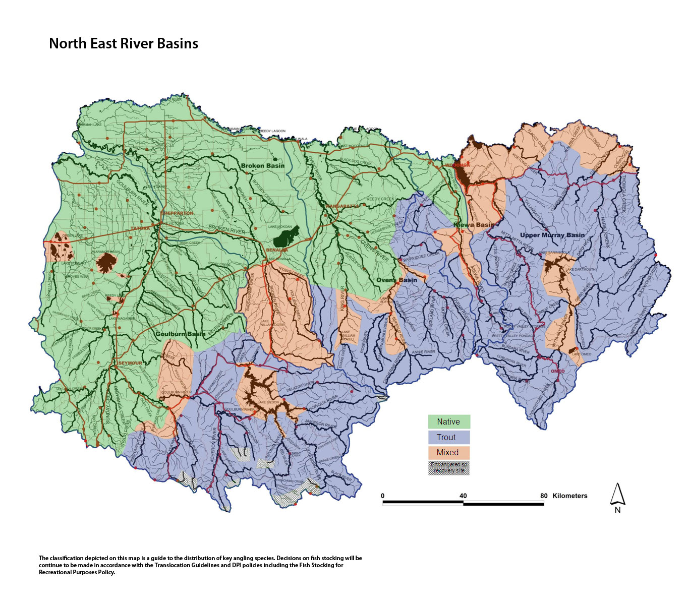 The North East region encompasses the Upper Murray, Mitta Mitta, Kiewa, Ovens, Goulburn and Broken basins and includes some of the most popular angling waters in Victoria. Popular angling species include brown and rainbow trout, Murray cod, golden perch, silver perch, Murray spiny crayfish, blackfish and redfin. Macquarie perch is regionally valued at Lake Dartmouth.